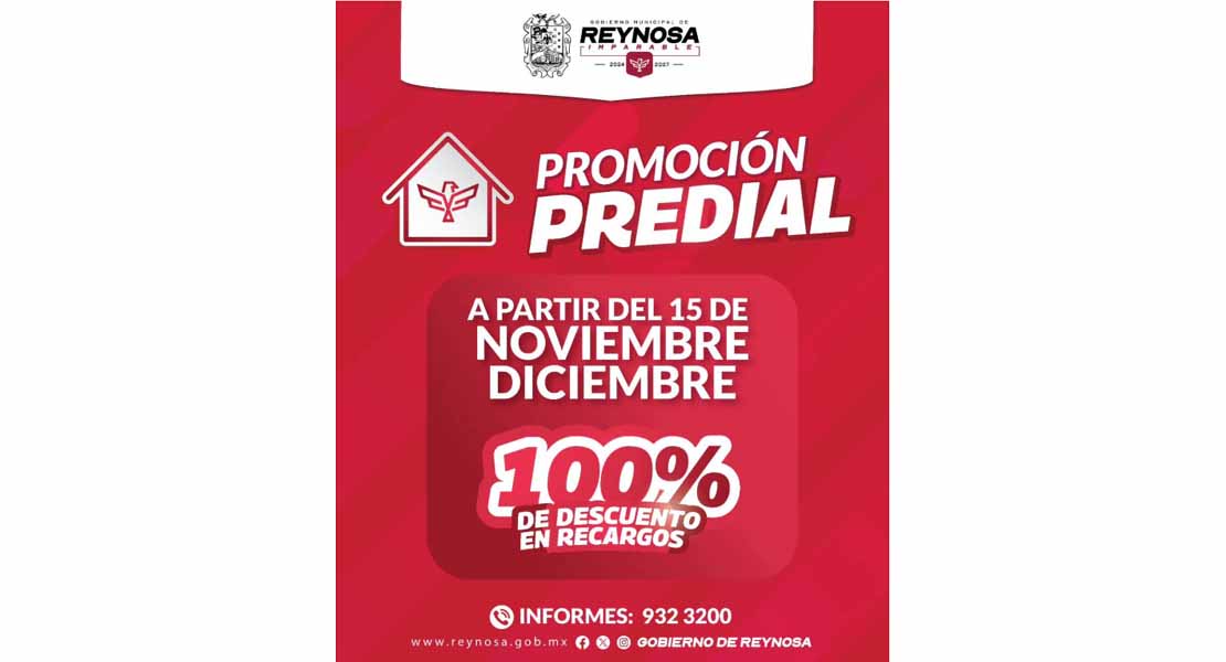 Reynosa, Tam.- El Gobierno del Presidente Carlos Peña Ortiz ofrece la promoción en el Impuesto Predial, del 100% de condonación de recargos durante noviembre y diciembre, descuento que puede ser obtenido en las cajas de Finanzas y Tesorería, oficinas foráneas de COMAPA, cajeros automáticos del Ayuntamiento y página web del Municipio.