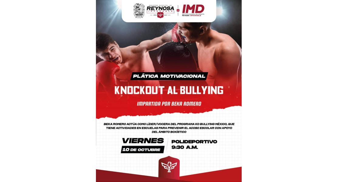 Reynosa, Tam.- El Alcalde Carlos Peña Ortiz, invita a la comunidad estudiantil y al público en general a participar en la plática motivacional “Knockout al Bullying”, que se llevará a cabo este viernes 10 de octubre a las 9:30 de la mañana en el Polideportivo de Reynosa.