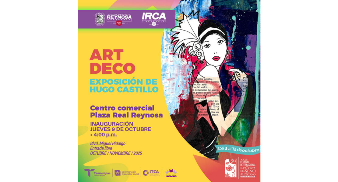 Reynosa, Tam.- En el marco del XXXII Festival Internacional en la Costa del Seno Mexicano, el Gobierno de Reynosa, que preside el Alcalde Carlos Peña Ortiz, presenta la exposición pictórica «Art Deco», del artista visual Hugo Castillo.