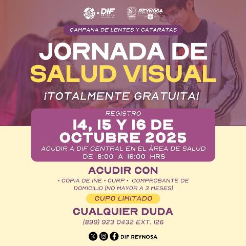 Reynosa, Tam.- Con el propósito de fortalecer el bienestar de las familias y brindar atención médica accesible a quienes enfrentan padecimientos visuales, el Sistema DIF-Reynosa, que preside Carlos Luis Peña Garza, realiza el Registro para la Jornada de Salud Visual, una campaña gratuita que busca detectar y atender problemas de la vista a través de revisiones y entrega de lentes, así como beneficiar con cirugías de cataratas.