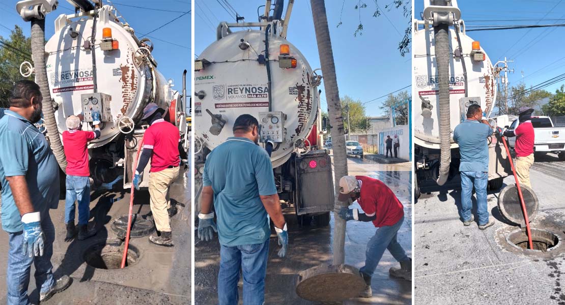 Reynosa, Tam.- La Comisión Municipal de Agua Potable y Alcantarillado de Reynosa trabajó en el sondeo de la línea general de drenaje sanitario en distintos puntos del fraccionamiento Reynosa, con el objetivo de mantener bajos los niveles de la red y asegurar el adecuado funcionamiento del sistema sanitario en el sector, previniendo taponamientos y posibles escurrimientos.