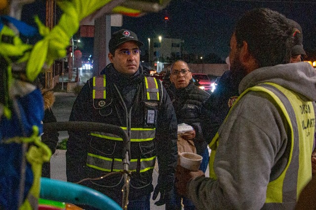 Reynosa, Tam.- Por instrucciones del Presidente Municipal Carlos Peña Ortiz, personal de Protección Civil y Bomberos efectuó el Operativo Carrusel, para detectar personas en las calles, que por su condición son vulnerables a las bajas temperaturas, a quienes se ofrece traslado al Albergue Temporal, o en su caso se les regalan cobijas para el frío, bebidas calientes y pan dulce.