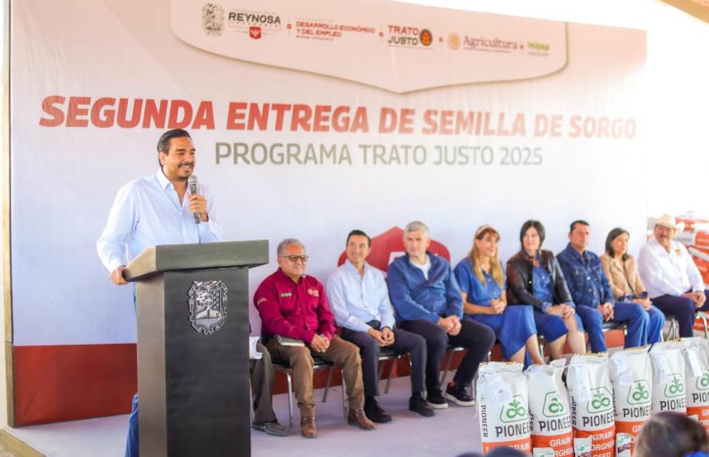 Reynosa, Tam.- «Me uno a las palabras de agradecimiento y reconocimiento hacia Carlos Víctor Peña Ortiz, Alcalde de Reynosa, por el programa Trato Justo, que ha sido un verdadero apoyo para las familias campesinas», dijo con emoción ante familias del campo, el señor Eleodoro Quintero Ballesteros, en presencia de la Senadora Maki Esther Ortiz Domínguez y los Diputados Casandra Priscila De los Santos Flores, Claudia Alejandra Hernández Sáenz y Juan Carlos Zertuche Romero.