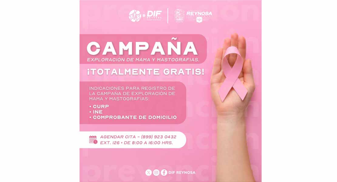 Reynosa, Tam.- El Sistema DIF Reynosa, que preside Carlos Luis Peña Garza, invita a todas las mujeres de la ciudad a participar en la Campaña Gratuita de Exploración de Mama y Mastografías, que se mantiene activas durante este año.