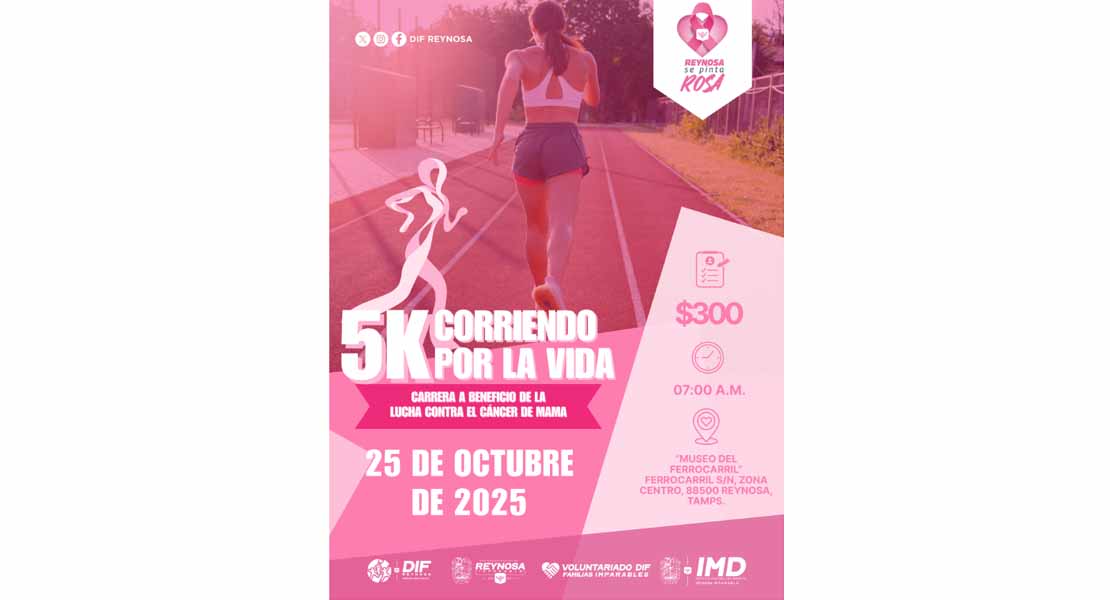 Reynosa, Tam.- Cada paso cuenta cuando se corre por una causa que salva vidas, por lo que el Sistema DIF-Reynosa, que preside Carlos Luis Peña Garza y el Voluntariado que encabeza Alejandra Yelitza Garza, en coordinación con el Instituto Municipal del Deporte, invitan a la ciudadanía a participar en la Carrera 5K “Corriendo por la Vida”, que se llevará a cabo este próximo sábado 25 de octubre, a las 7:00 de la mañana, con punto de partida en el Museo del Ferrocarril, ubicado en la zona centro de Reynosa.