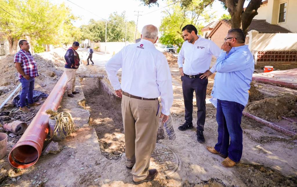 Mediante el Programa de Obra Pública Más Grande en la Historia de Reynosa 2025, son rehabilitados con nueva tubería más de 400 metros lineales que incluyen 6 construcciones de descargas sanitarias de PVC de 20 y 30 centímetros de diámetro.