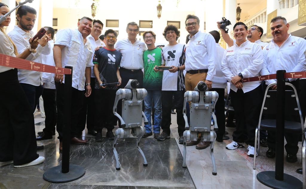 Al término de la ceremonia de honores, el gobernador recibió al grupo de estudiantes de la carrera de Ingeniería en Mecatrónica de la Universidad Politécnica de Victoria, que forman parte del taller-comunidad NIX-Lab y que recientemente tuvieron una destacada participación en un concurso internacional celebrado en Brasil, quienes le presentaron una exhibición de dos robots Unitree Go2 operados a distancia.