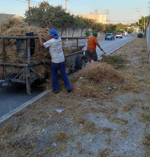 Reynosa, Tam.- El Gobierno Municipal que preside Carlos Peña Ortiz efectúa limpieza general en el fraccionamiento Villas de Esmeralda, donde a detalle las cuadrillas cortan maleza recolectan basura acumulada en las calles.
