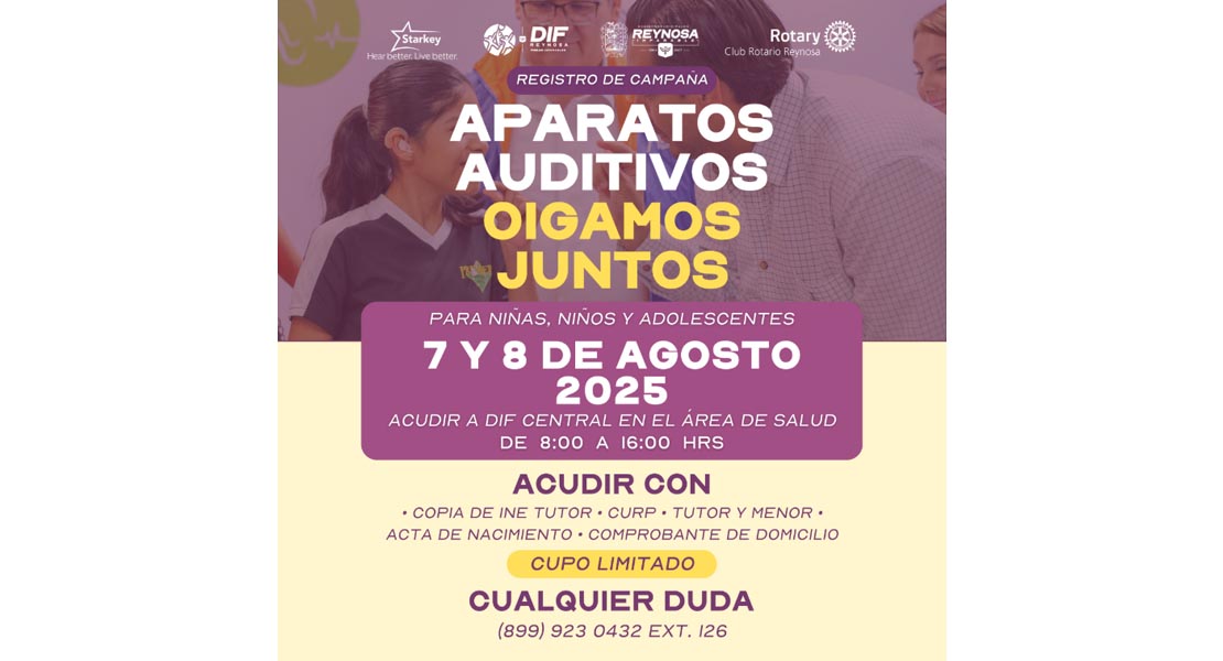 Esta campaña se desarrolla en coordinación con el Club Rotary y la Fundación Starkey, por lo que DIF-Reynosa, invita a las familias a registrar a sus hijos, a fin de que puedan acceder a este beneficio que transforma vidas.