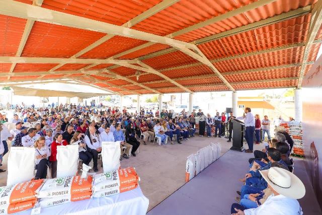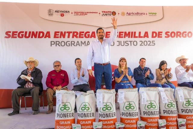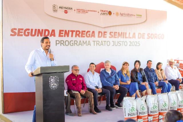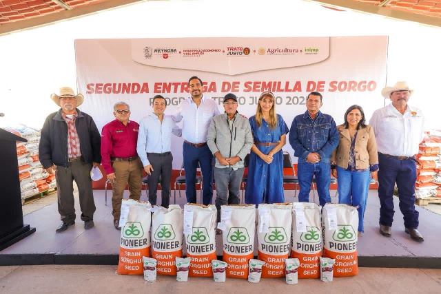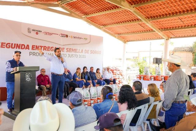 Reynosa, Tam.- Al presidir la entrega de 26 toneladas y 820 kilos de semilla de sorgo a 185 productores del campo reynosense en más de 35 ejidos, mediante el programa municipal «Trato Justo», el Alcalde Carlos Peña Ortiz los invitó a analizar el cambio de cultivos: ‘tenemos que empezar a diversificar para poder mejorar rendimiento e ingreso; el sorgo dio treinta, cuarenta años pero se ha batallado muchísimo, hay que empezar a explorar la soya, el ajonjolí».